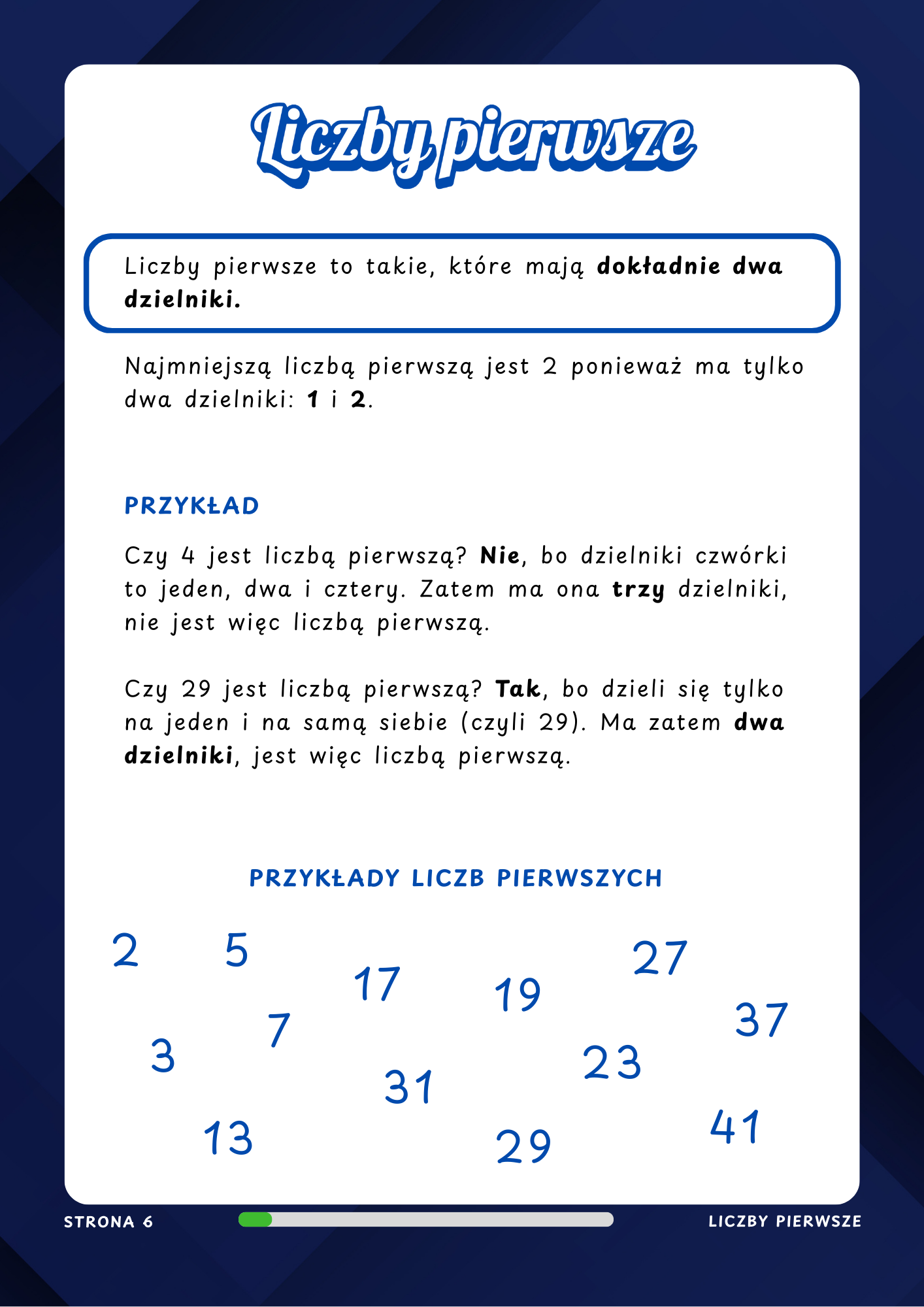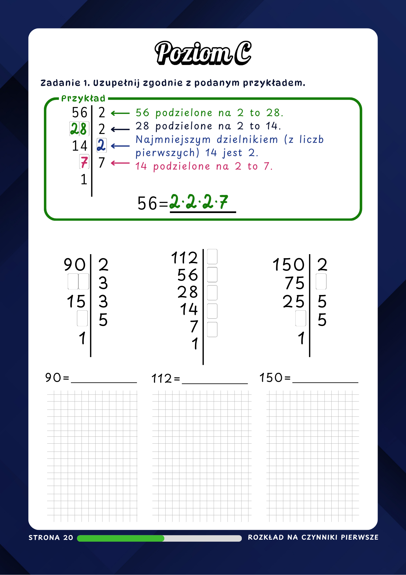 • krótkie i proste wyjaśnienia teorii – rozróżnienie liczb złożonych i pierwszych, schemat i ćwiczenia rozkładu na liczby pierwsze